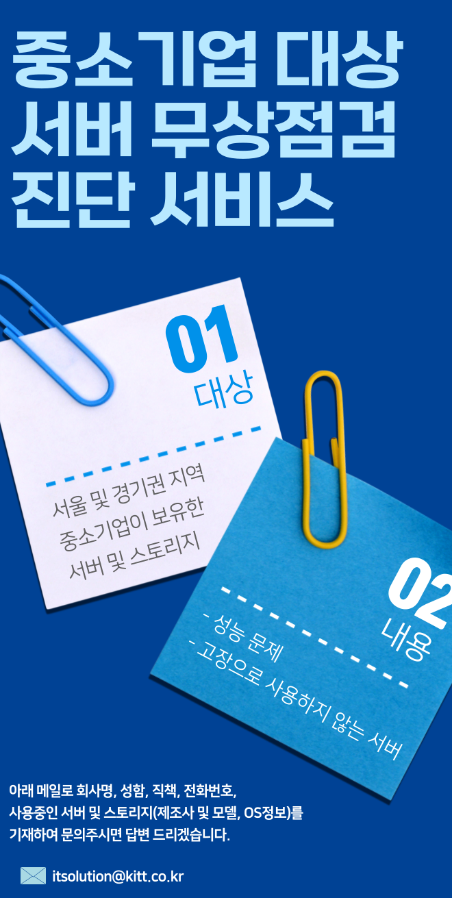 공지 이벤트 숨김 ⚒ 서버 무상점검 및 진단 서비스! 한국아이티진흥 23-12-21 09:30 본문 댓글0 이전글 입점업체 대상 EDM 프로모션 소개 이벤트! 다음글 아이티솔루션 회원사 대상 서버 무상임대 이벤트! 목록