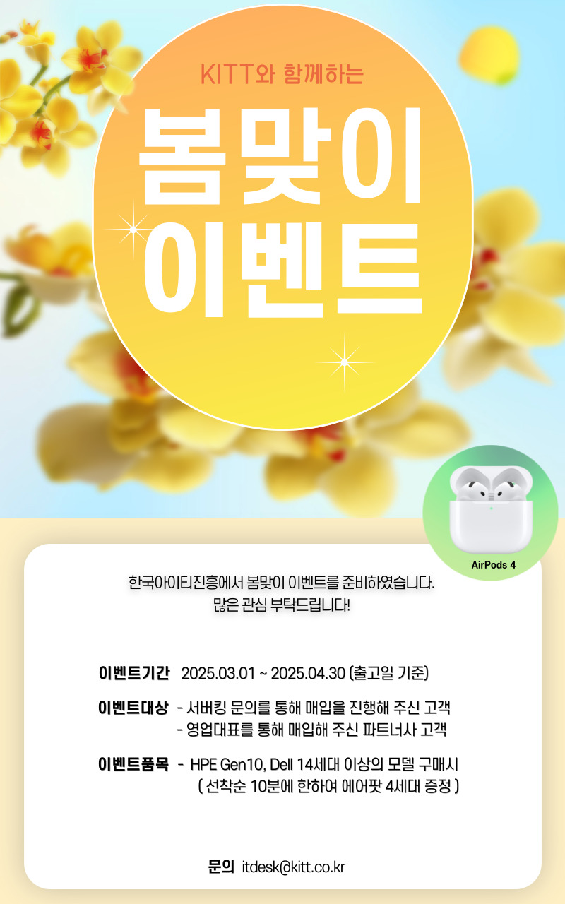 이벤트 숨김 KITT와 함께하는 봄맞이 이벤트 한국아이티진흥 25-02-18 15:17 본문 댓글0 이전글 우리 회사 홍보를 아이티솔루션과 함께! 다음글 독립적인 IT장비를 운용할 수 있는 DemoRoom 오픈! 목록