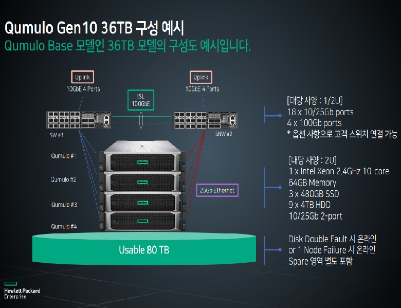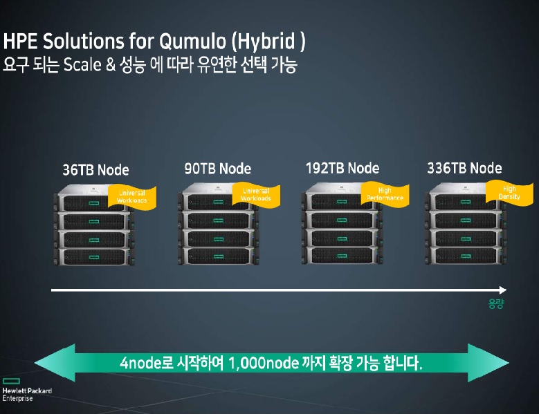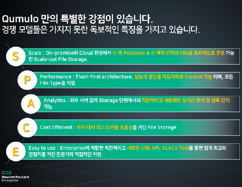 대용량 비정형 파일을 고성능, Scale-out으로 처리/저장/관리할 수 있는 SDS(Software Defined Storage) 솔루션 Qumulo와 HPE의 뛰어난 Proliant, Apollo 플랫폼으로 우수한 성능과 편의성을 지원하여 경제적인 비용으로 지원.