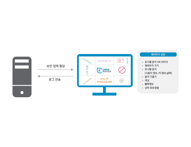 이노마크는 촬영 및 캡처에 의한 회사의 중요 자료 유출 방지, 사용자별 워터마크 사용 환경이 상이한 점을 고려하여 색상·투명도·기울기 등 자유자재로 편집이 가능하며, 수정 시 미리 보기 기능으로 사용 편의성이 탁월한 솔루션입니다.