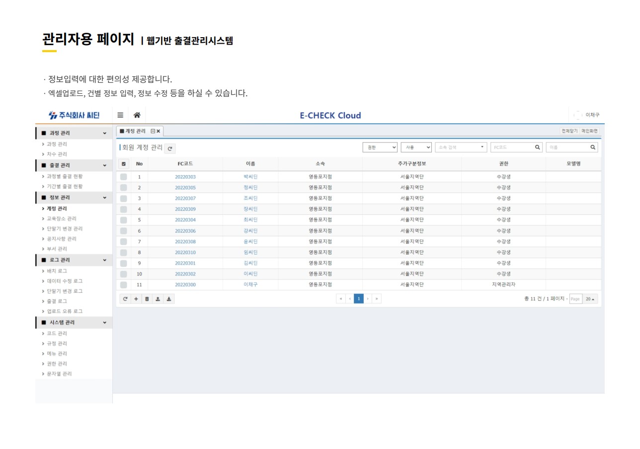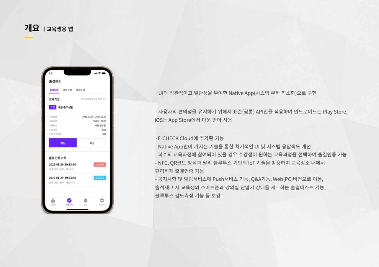 기업ㆍ협회ㆍ교육기관 등에서 활용 가능한 교육이력관리시스템(출결관리시스템)입니다. BLE Beacon 을 활용한 위치기반의 교육참여인증은 물론 QR코드를 활용한 간편 인증 등 다양한 인증수단을 통한 교육참여인증이 가능하며, 관리자는 대량의 사용자정보, 교육과정정보 등의 데이터 관리와 교육참여이력 수정, 등록된 스마트폰 관리 등의 기능으로 출결의 정확성과 관리의 편리함을 제공하여 드립니다. 합리적인 비용으로 결제 직후 사용가능한 Cloud Version의 서비스와 고객의 사설망에 구축하여 사용환경 및 내부 시스템과의 연동까지 제공하는 Plus Version, 두가지로 공급 가능합니다.