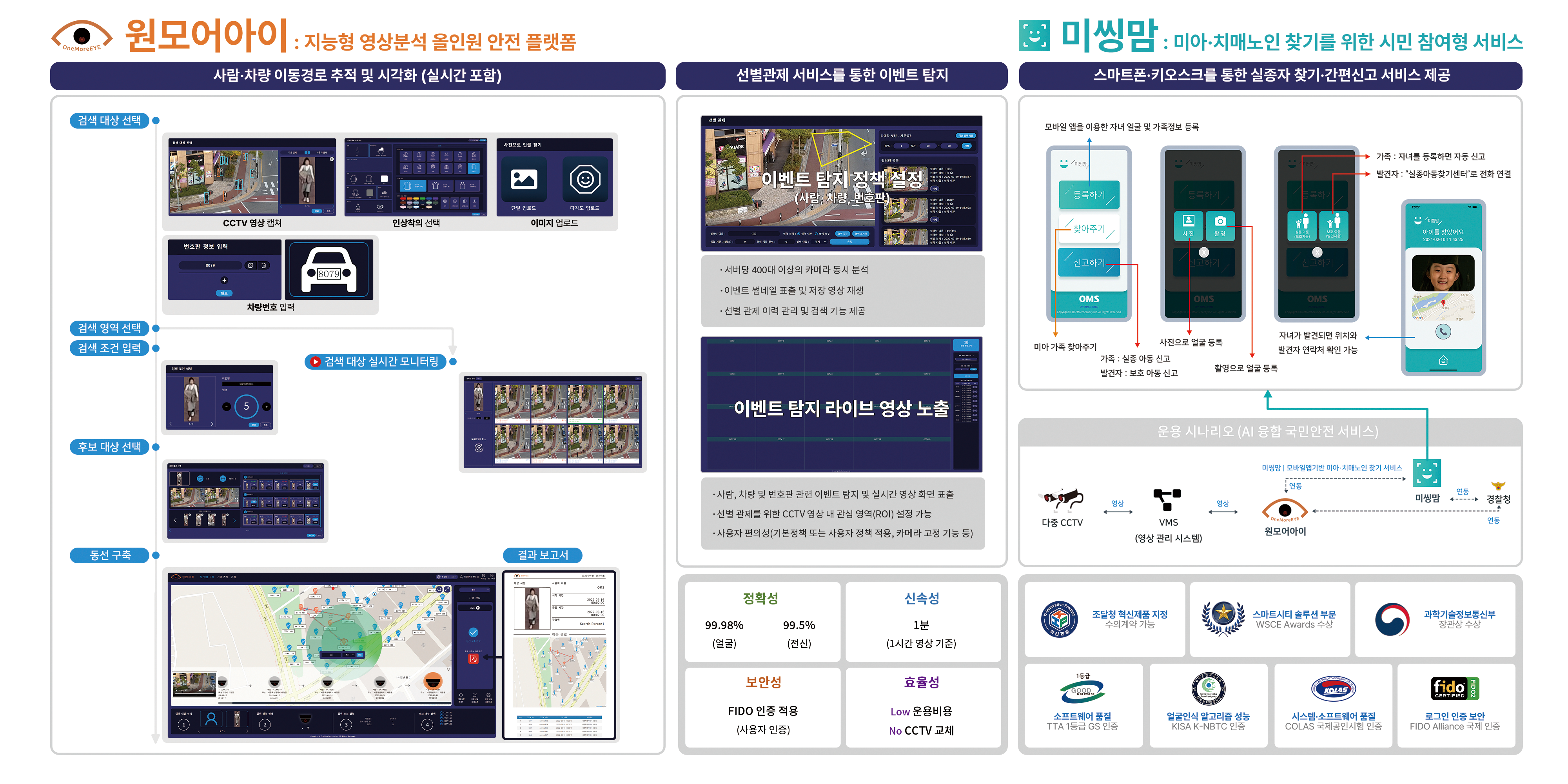↓ 아래 두 솔루션(원모어아이, 미씽맘)은 연계하여 사용 가능하며, 궁극적으로 CCTV영상 분석 시간을 줄여 빠르고 정확하게 실종자, 치매노인, 범죄자, VIP, 차량 등을 찾을 수 있습니다.