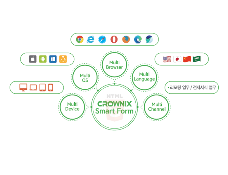 CROWNIX Smart Form은 신청서, 계약서, 동의서 등의 기존 종이 기반의 문서를 전자문서로 손쉽게 개발하여 사용자 디바이스에 제한없이 서비스할 수 있는 HTML5 기반의 전자문서 솔루션입니다.