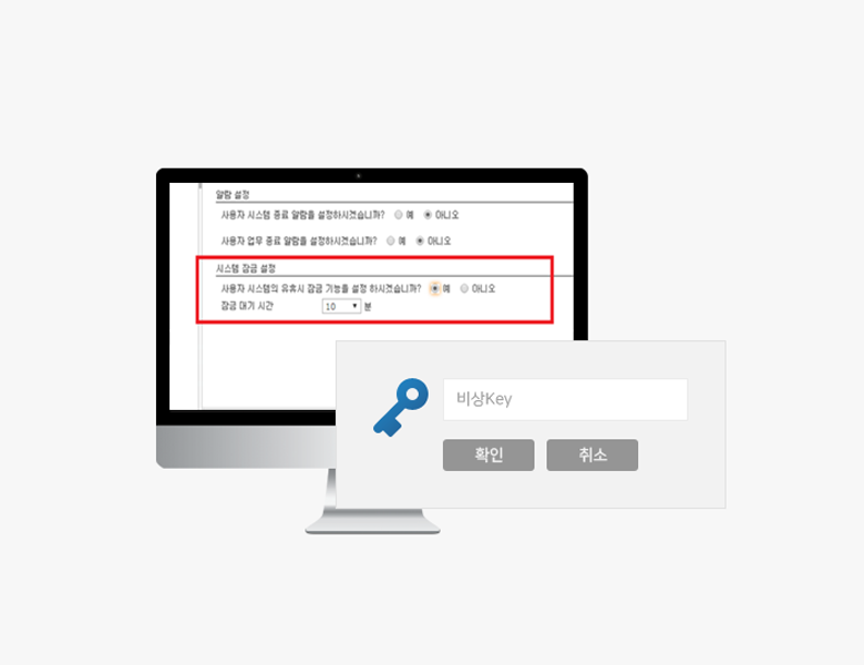 사업장별 비상 작업가능(비상키)설정 - 사용자로그인 및 PC 사용시간 관계없이 비상 상황에서 PC 작업 가능