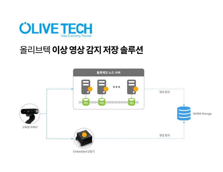 CCTV, 보안 카메라로부터 학습한 영상과 다른 이벤트 영상 입력 시 이를 딥러닝을 이용하여 감지하고, 감지된 영상을 위변조 방지 저장 장치에 저장하는 솔루션으로, 서버급 기기나 임베디드 엣지 단말기에 적용할 수 있는 SDK 형태로 제공합니다.