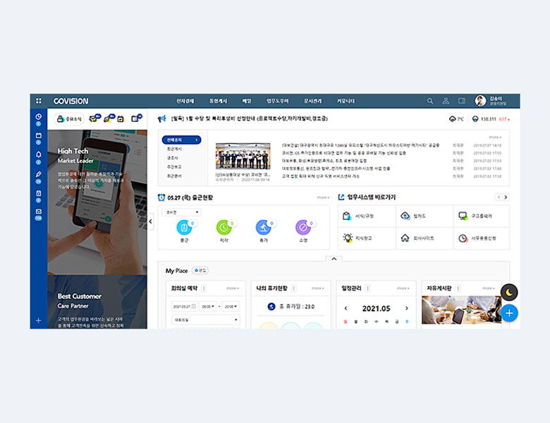 코비젼의 coviSmart²는 다양한 협업 기능을 갖춘 구축형 그룹웨어 솔루션입니다.