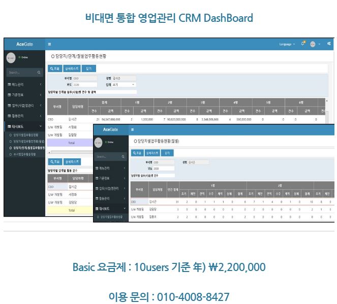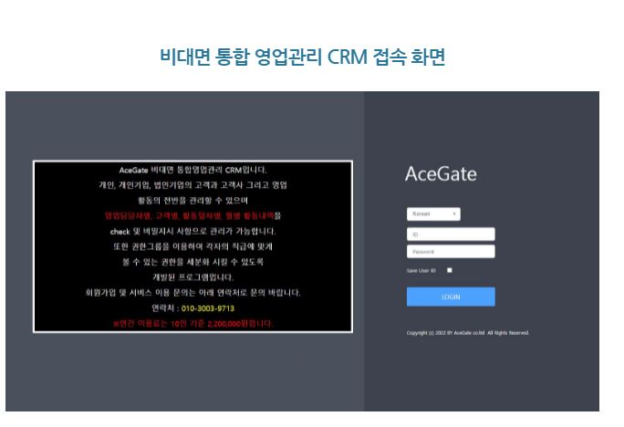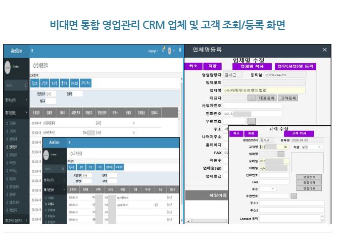 - 대표이사,임원,영업사원,관리팀,마케팅팀,회계팀 등 회사 내 전 부서원들이 사용하며 고객,업체,업무(사업), 활동 등 회사 전반의 업무를 고객관계관리 측면에서 관리하는 프로그램입니다 - 개인 및 개인사업자를 포함하여 각종 영업사원과 연구원 그리고 컨설팅 및 서비스요원들이 활용 가능합니다. - AceGate 비대면 통합영업관리 CRM 시스템의 주요 기능으로는 고객관리, 업체관리, 업무(사업)관리, 활동관리( 제안, 견적, 수주, 계약), 대시보드 등이 있습니다.