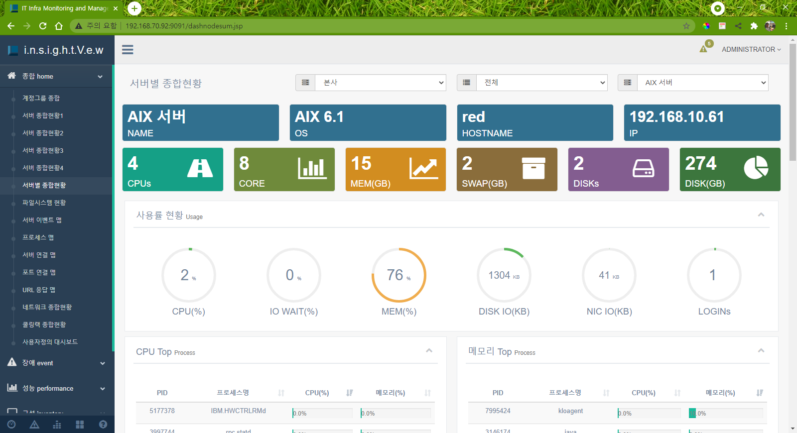 클라우드/IDC 및 시스템 운영자를 위한 IT 인프라 모니터링 솔루션으로 Linux/Unix, Windows 서버 및 도커 컨테이너, 가상화서버, 데이터베이스, WAS, 네트워크, 쿨링랙, 서버 취약점, IP 주소 관리, 가동률, 배치작업 등 IT 인프라 자원에 대한 장애/성능/구성정보 모니터링을 통하여 IT 인프라 자원의 안정적인 운영을 지원합니다. IT 인프라 자원에 대한 주요 상태 정보를 직관적으로 파악하고 관리할 수 있도록 효율적인 각종 기능을 제공하고 있습니다.