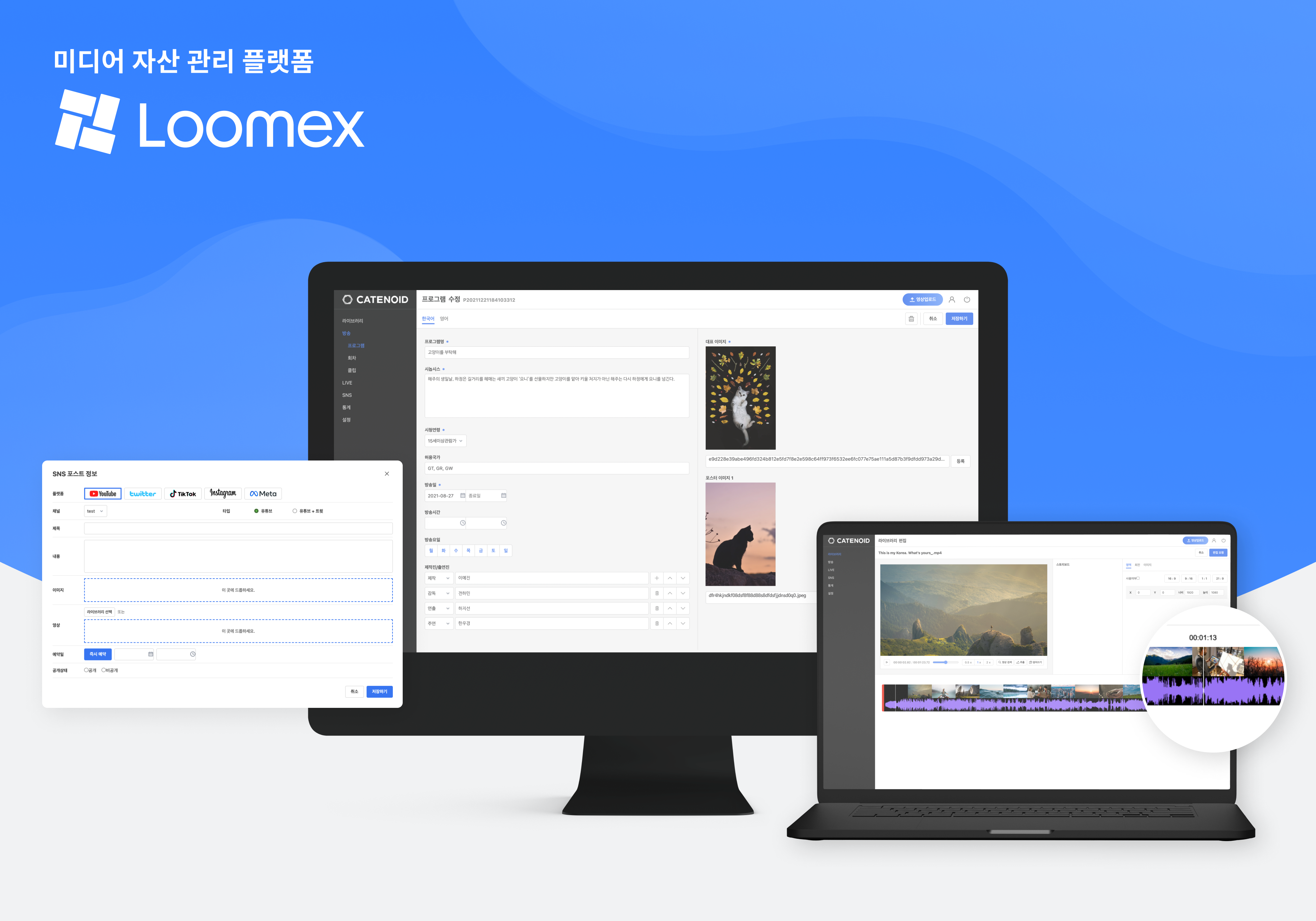Loomex는 클라우드 기반의 SaaS형 MAM(Media Content Management) 서비스로 고객사의 미디어 자산 관리 기능 뿐만 아니라, 서비스 재생산에 필요한 다양한 부가 기능을 제공합니다.