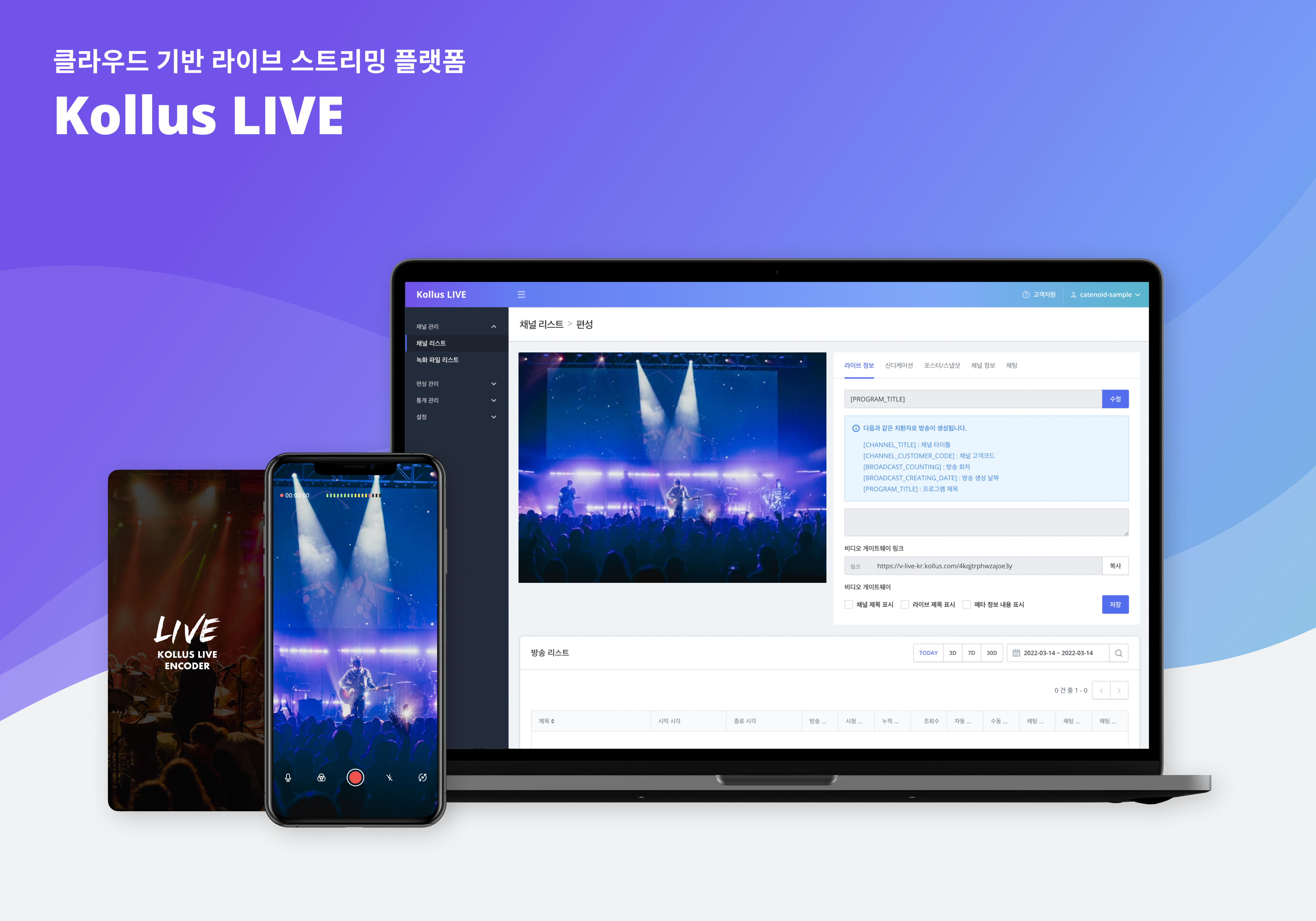 콜러스(Kollus) LIVE는 라이브 동영상 촬영부터 채널방송, 시청 플레이어까지 라이브 스트리밍의 모든 서비스를 제공합니다.