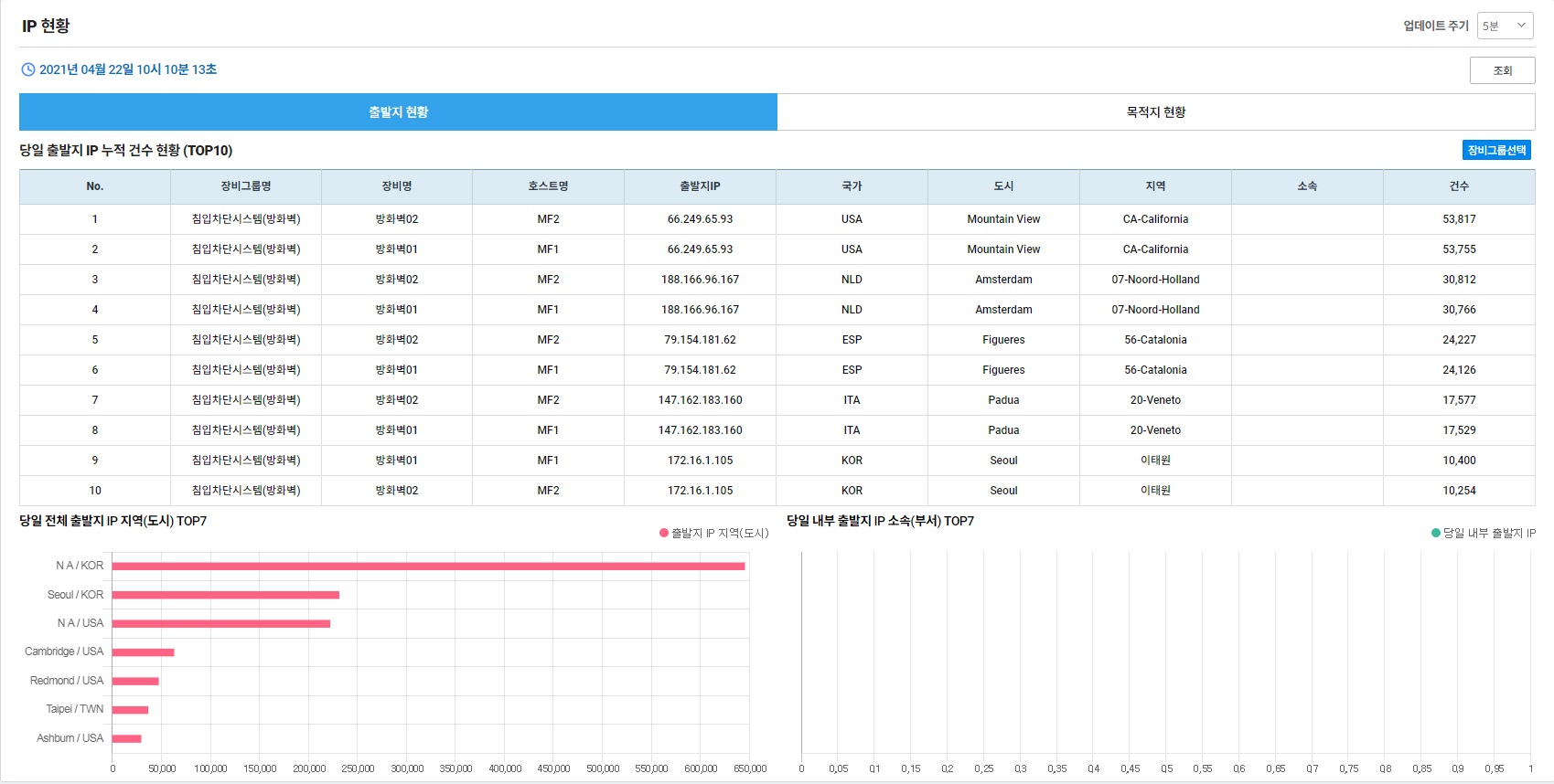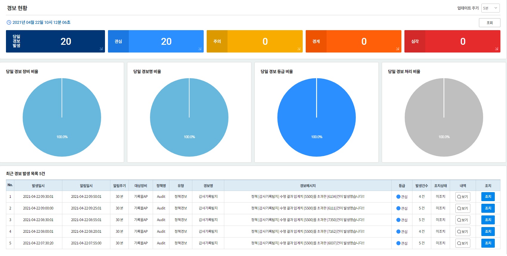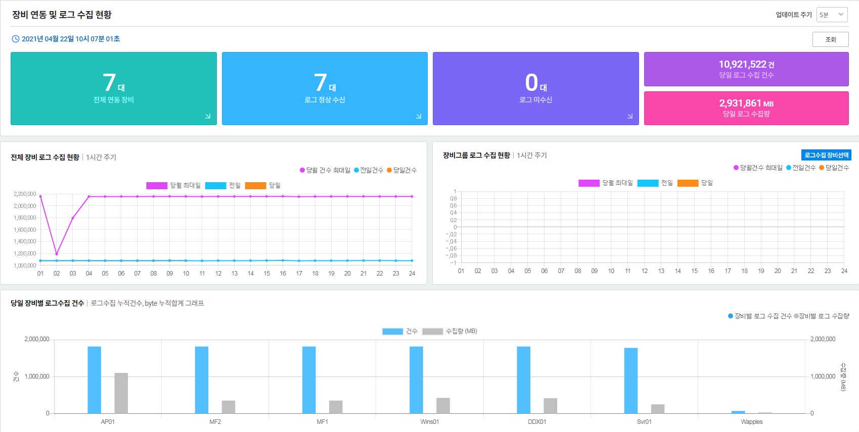로그수집현황, IP 현황, 코드현황, 시그니처 현황, 경보현황의 용도별 대시보드 지원 / 분석 정책 결과를 대시보드에 표현 가능한 정책 대시보드 지원