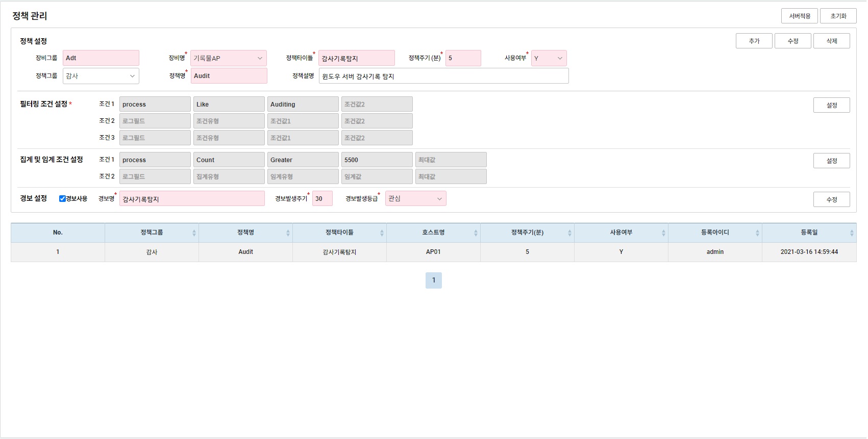 최근 100일 수집된 코드 및 시그니처 발생 건수를 자동으로 분석, 클릭 한번으로 간편하게 분석 정책을 생성할 수 있는 자동 정책생성 기술 적용