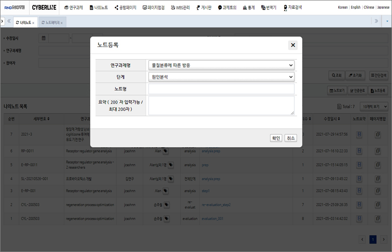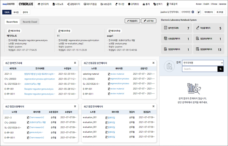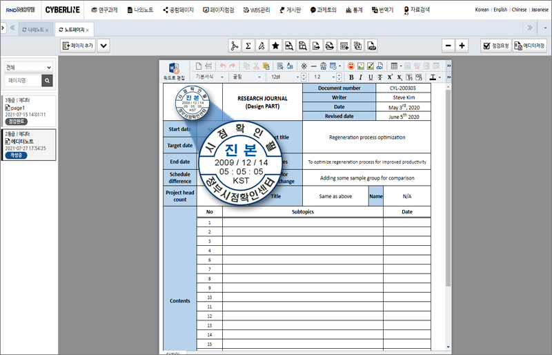 연구노트 작성 뿐만 아니라 연구과제관리 등을 가능하게 합니다. 한글, MS-Office 호환이 가능하고