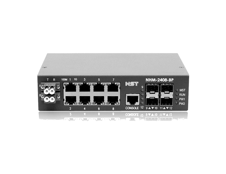 NHM-2408BP는 산업용 Fast-Ring 네트워크 구축, 도로 또는 철도의 CCTV, 멀티미디어 서비스 구축, U-City의 CCTV망 구축, 핫스팟 지역의 무선랜 망 구축 등 고속의 LAN 접속을 필요로 하는 곳에 적합하도록 설계된 레이어 2 기반의 고성능 산업용 스위치 입니다.