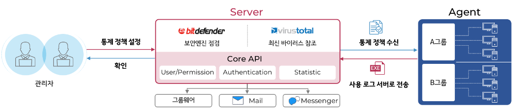 배포 파일 등록 시 악성 코드 점검 / 자유로운 배포 대상 선정(개별, 조직, 전체) / 자동 배포 및 결과 이력 관리