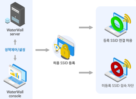 워터월 AP Scan(WW AP Scan)은 관리자의 SSID 등록을 통하여 사용자가 등록된 SSID의 AP만 접속할 수 있도록 통제합니다. 기업 또는 공공기관의 내부망 보호를 위해 인가되지 않고 설치•운영되는 무선 AP 단말을 효과적으로 제어합니다.