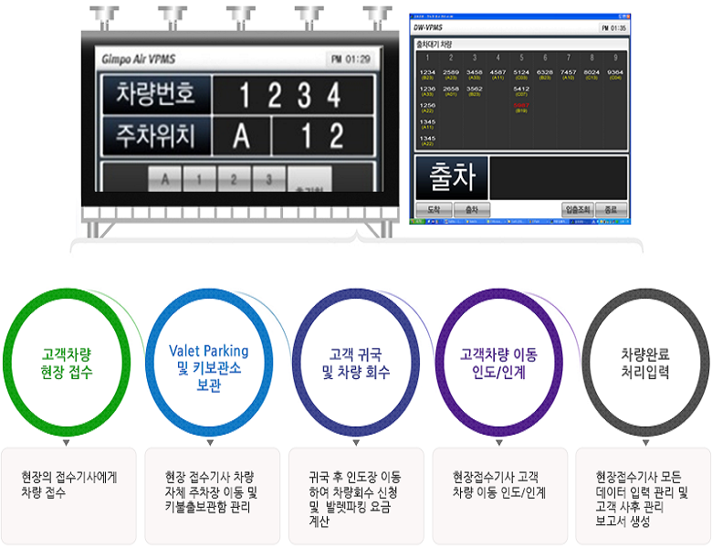 고객의 차량을 안전하게 주차 대행하여 안전하게 보관하고 고객의 요청시간에 차량을 고객에게 인도하는 관리 시스템( Valet관리, 주차관리, 인도관리, 정산관리, 고객사후관리)