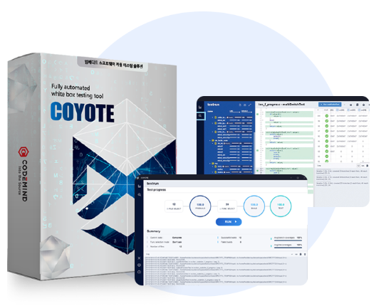 소프트웨어 자동검증 도구 완전자동화! 커버리지 향상! 유연한 설정! 등 COYOTE는 사용자 편의를 최대화 하도록 개발된 동적 검증도구입니다.