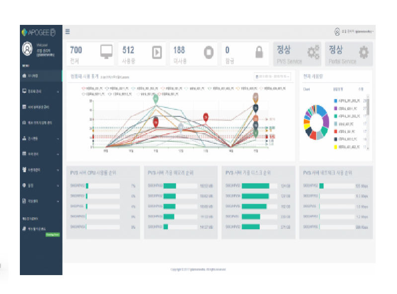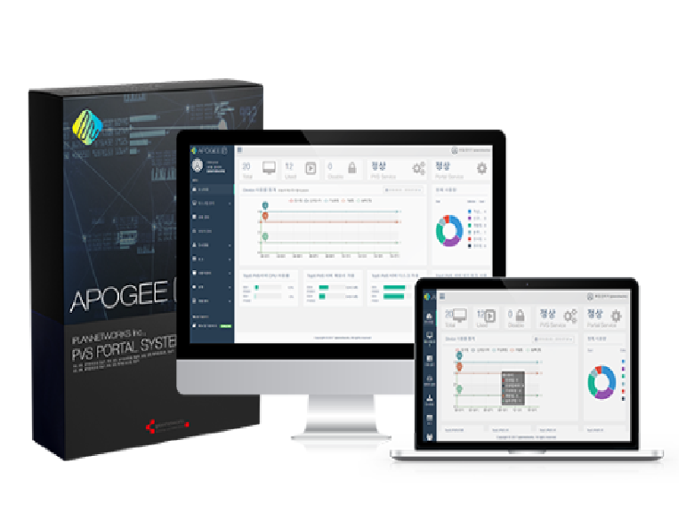 APOGEE는 데스크탑 가상화(VDI) 및 클라우드 PC (PVS)를 더욱 쉽고 간편하며 강력하게 관리 할 수 있는 운영/관리 솔루션입니다. 또한 운영 실무자의 효율적인 운영을 위해 직관적인 모니터링/통계 인터페이스를 통해 유의미한 데이터 통계 및 실시간 모니터링 기능을 제공합니다.