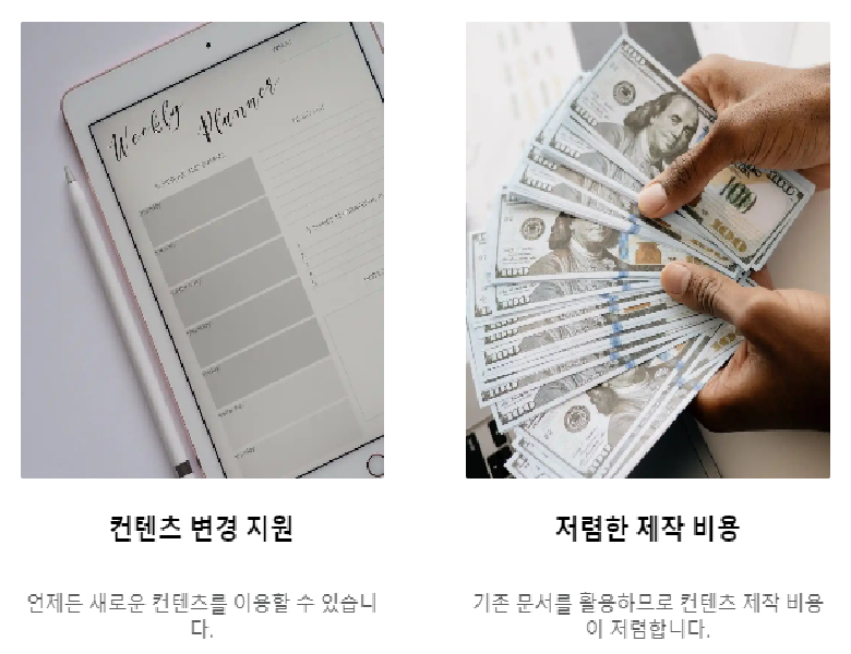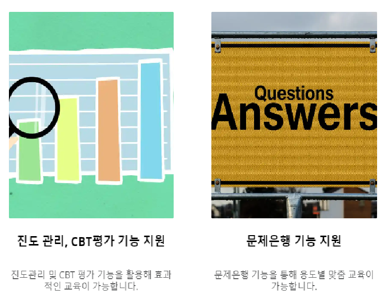 • 컨텐츠 변경, 저렴한 제작비용, 진도관리, CBT평가 기능 지원