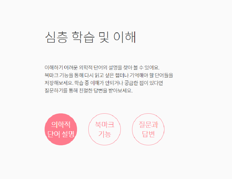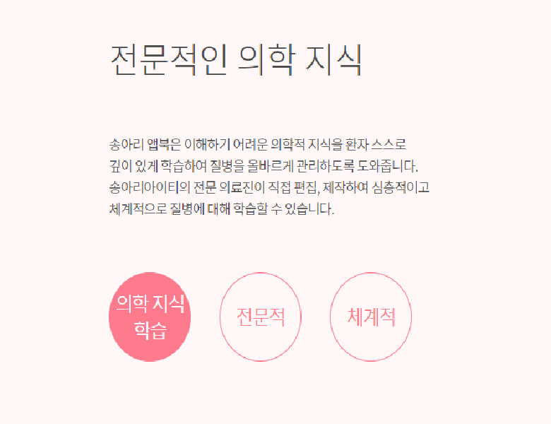 이해하기 어려운 의학적 지식을 전문 의료진이 제작하여 쉽게 풀이해 제공하는 모바일 학습 서비스입니다. 심층적이고 체계적인 학습으로 올바르게 질병을 관리할 수 있도록 도와줍니다.