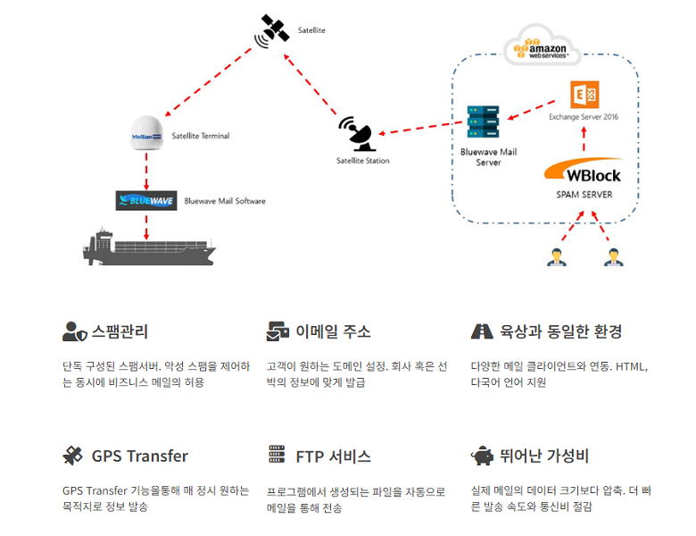 시너샛코리아의 오랜 경험과 기술력을 바탕으로 개발된 새로운 위성 통신 이메일 프로그램인 Bluewave Mail은 보다 안전하고, 안정적인 아마존 웹 클라우드 기반 서비스로 제공됩니다. Bluewave Mail은 해운 산업에 대한 이메일의 중요성을 인식하고, End-User의 편리함을 강조하였습니다.