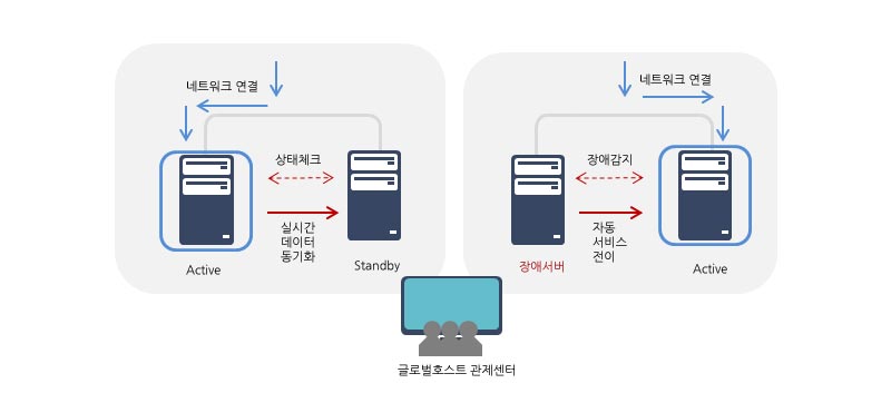 각종 장애로 인한 서비스 중단없이 서비스 지속성 구현, 서버와 클라우드간 및 글로벌 구간의 DR 구성 각종 장애로 인한 서비스 중단으로 인한 다운타임을 방지하기 위해 서비스 영속성을 보장하고, 가용성을 극대화할 수 있는 솔루션입니다. HA/재해복구 솔루션은 자동장애처리, 실시간 데이터복제, 서버클러스터링을 통해 24시간 다운타임없이 서비스가 지속될 수 있도록 하고 있습니다.