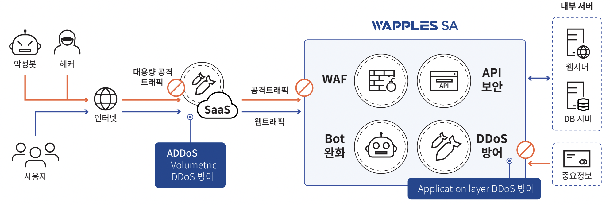 WAPPLES SA for Cloud(WAPPLES Software Appliance for Cloud)은 15년 연속으로 국내 웹방화벽 시장 점유율 1위를 유지하고 있는 WAPPLES의 수준 높은 기술력을 바탕으로 개발한 클라우드 WAAP(Web Application and API Protection) 솔루션이자 지능형 웹방화벽입니다. WAPPLES SA for Cloud는 기존 웹방화벽의 기능 뿐만 아니라 웹보안에 필요한 API 보안, Bot 완화, DDoS 방어의 기능도 수행합니다. 뿐만 아니라 Public Cloud 및 Private Cloud 등 어떤 클라우드 환경에서도 웹 보안 지원이 가능한 제품입니다.