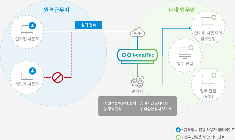 아이원재택(i-oneJTac)은 재택근무 보안 고려사항을 준수하며, 안전한 재택근무를 위한 편리한 원격접속과 강화된 보안까지 한번에 제공하는 재택근무 솔루션입니다.