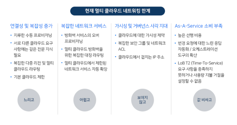 멀티 클라우드 네트워킹 | Alkira 현재 클라우드 네트워킹은 복잡하고 대부분 정적이면서도 지루한 업무 흐름을 거쳐 수작업으로 진행됩니다. 이러한 클라우드 네트워크는 IPSec 기술에 기반하거나 다이렉트 클라우드 액세스가 가능한 코로케이션 시설을 활용하여 조직의 광역 네트워크를 퍼블릭 클라우드에 연결합니다. SaaS 애플리케이션이 여전히 데이터센터를 통해 여러 번 프로비저닝되는 경우 애플리케이션 지연 시간이 길어지고 네트워크 대역폭 부족을 초래해 애플리케이션에 대한 부정적 경험으로 이어지게 됩니다. 서로 다른 퍼블릭 클라우드 아키텍처로 인해 조직은 개별 퍼블릭 클라우드 제품에 대한 심층적인 네트워크 전문 지식을 습득해야 합니다.