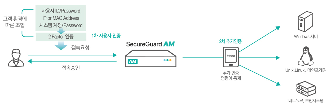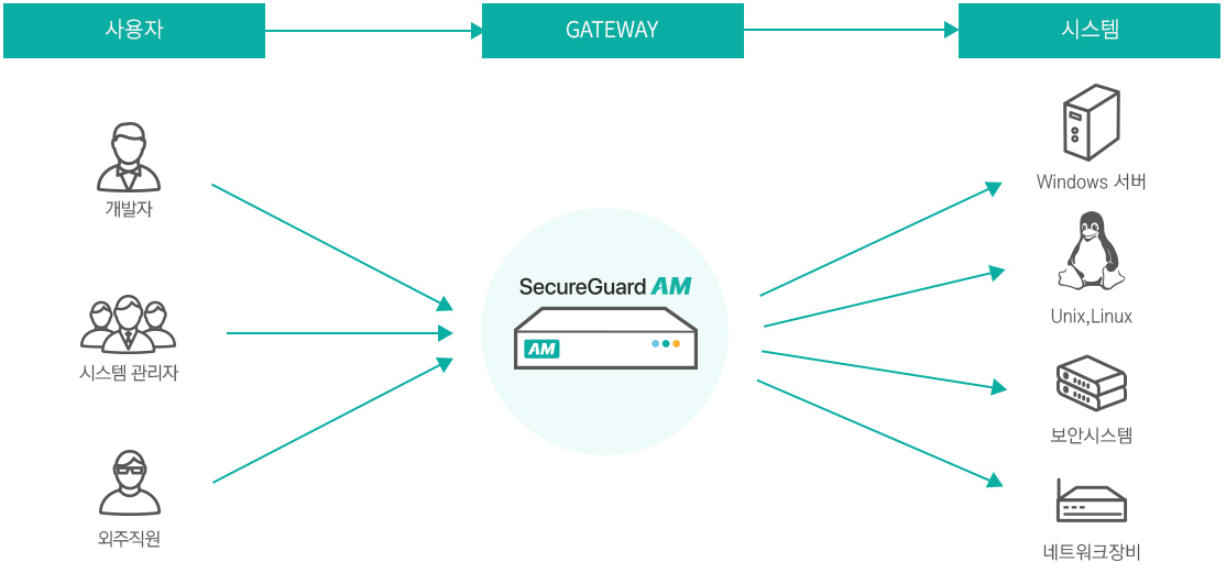 SecureGuard AM은 서버, 네트워크, 보안시스템, 메인프레임 등 네트워크 상의 모든 시스템에 접속하기 위한 단일 게이트웨이로써 시스템의 보안과 관리효율성을 보장하는 솔루션 입니다.