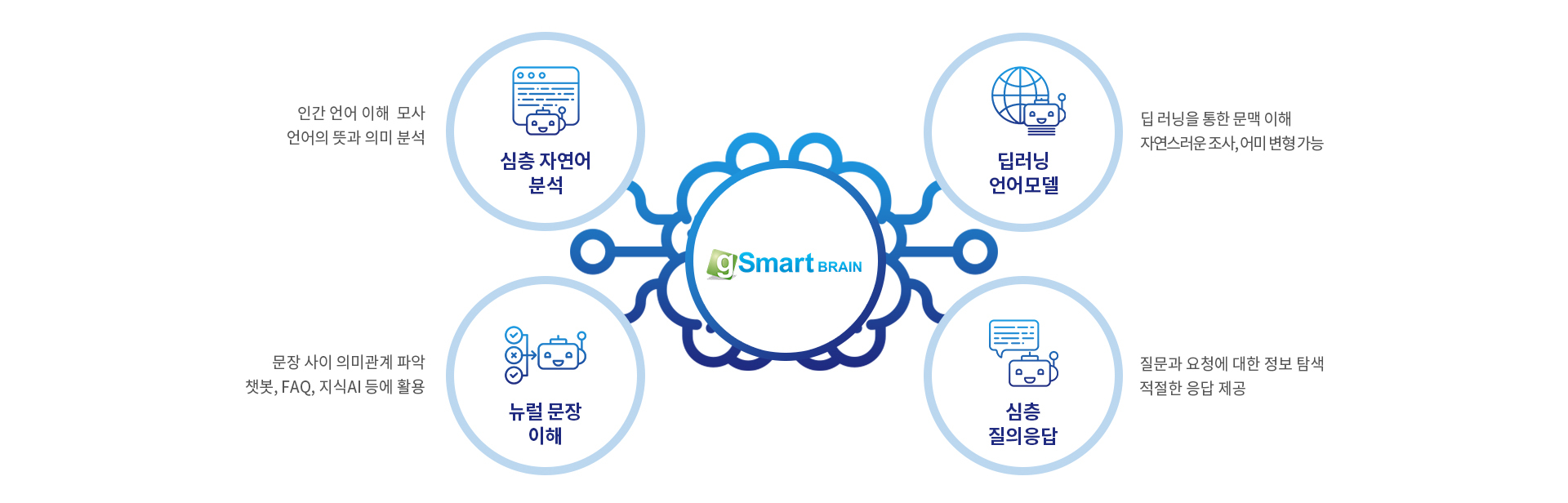 gSmart BRAIN은 언어를 이해하고 지식을 학습하여 지식을 서비스하는 AI 기술 입니다. 복잡한 인간 언어의 뜻을 분석하고, 문맥을 이해하며, 의미관계를 정확하게 파악해 이를 바탕으로 사용자와 질의응답 및 대화가 가능한 소통환경을 만들어줍니다.