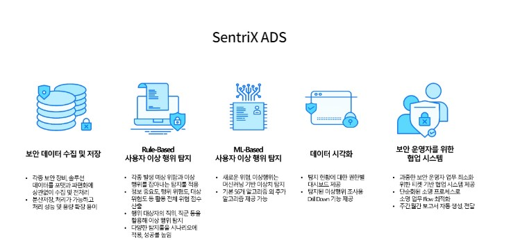 SentriX ADS(Anomaly Detection System)는 오랜 시간 국내 주요 기업과 기관의 보안을 책임진 가이온이 그 경험과 노하우를 기반으로 다양한 시나리오를 가지고 인공지능 머신러닝 기술을 접목시켜 각종 보안사고를 예방하는 시스템입니다.
