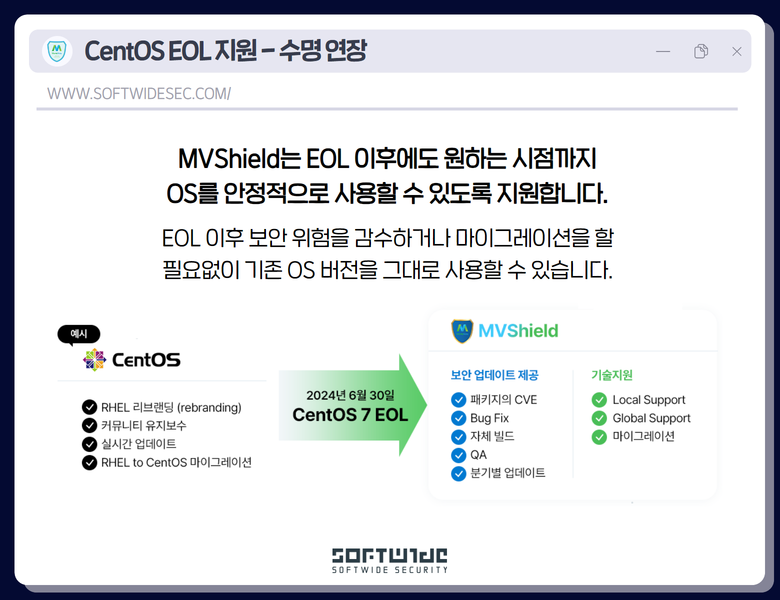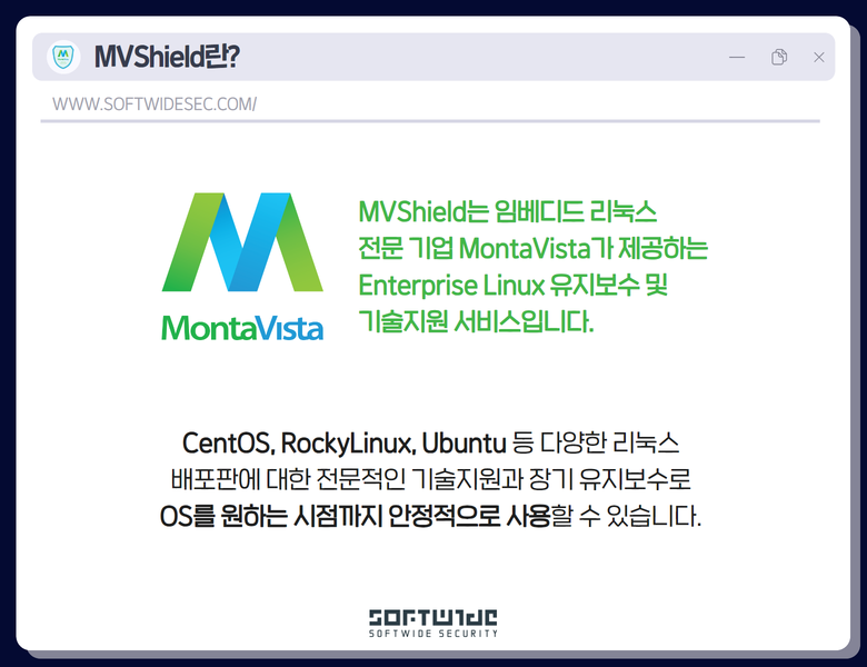 MVShield는 임베디드 리눅스 전문 기업 MontaVista가 제공하는 엔터프라이즈 리눅스 유지보수 및 기술지원 서비스입니다. 몬타비스타의 최신 리눅스 빌드 시스템, 방대한 테스트 인프라 및 다양한 검증 도구를 기반으로 CentOS, RockyLinux, Ubuntu, Yocto 등과 같은 다양한 리눅스 배포판에 대한 지속적인 보안 업데이트, 10년 이상의 장기 유지보수와 기술지원 서비스를 제공합니다. MVShield는 오픈소스 기반의 엔터프라이즈 리눅스에 대한 EOL OS 연장 지원 서비스를 제공합니다. 2024년 6월 30일 커뮤니티 지원이 종료되는 CentOS 7을 포함해 Rocky Linux, Ubuntu가 EOL된 이후에도 OS에 대한 Full Support를 보장하며, 수명 주기를 고객이 원하는 시점까지 연장할 수 있습니다.