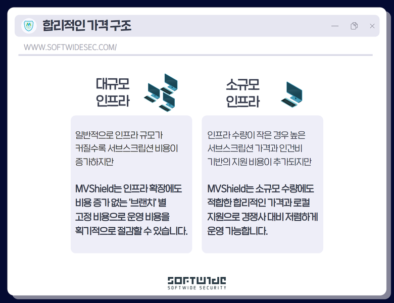 소프트와이드시큐리티는 세계 최고의 IT 보안 솔루션을 최상의 서비스로 제공하고 있는 보안 전문 기업입니다. 2007년 설립 이후 다양한 보안 전문 지식과 경험을 바탕으로 끊임없이 증가하는 보안 위협과 강화되는 규제 준수에 대처할 수 있는 글로벌 보안 솔루션을 국내 고객 환경에 맞게 연동 개발하여 서비스하고 있습니다. 보안 취약점 진단/관리 솔루션 공급 및 점검 서비스를 제공하는 보안 취약점 전문 회사에서 암호화, PAM, ID 보안, BAS(Breach and Attack Simulation), 클라우드 마이그레이션 등 그 영역을 확장하여 고객의 신뢰와 함께 성장해 나가고 있습니다.