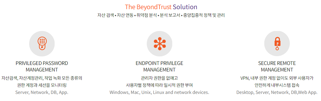 BeyondTrust는 Privileged Access Management(PAM) 분야의 세계적인 리더로서 Fortune 100대 기업의 절반 이상을 포함하여 전 세계 20,000여 고객사를 확보하고 있습니다. BeyondTrust Universal Privilege Management(UPM)는 기업 전체의 모든 권한을 보호하는 솔루션입니다.