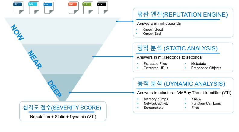 VMRay 는 에이전트리스의 악성코드 분석 솔루션으로 하이퍼 바이저 기반의 모니터링 기술, 평판 엔진(REPUTATION ENGINE), 정적 분석(SATIC ANALYSIS), 동적 분성(DYNAMIC ANALYSIS)을 종합한 심각도 점수를 통하여 위협 행위의 악성 행위 여부를 판별합니다.