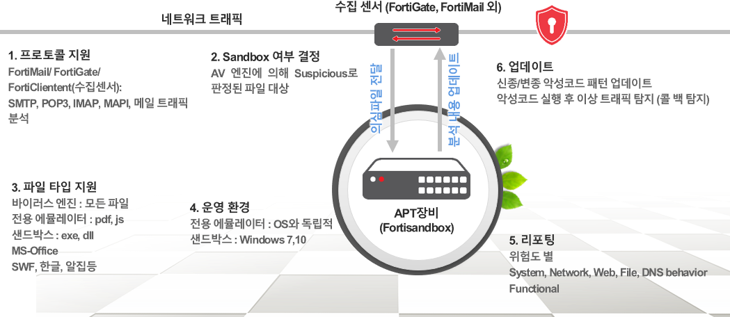 업계최고의 글로벌 보안 서비스를 자랑하는 FortiGuard의 Anti-Virus와 Static정적분석 엔진을 통하여 이미 알려져 있는 각종 악성파일들을 효율적으로 탐지하고 차단합니다. hwp와 같은 국내 로컬 파일들을 커스텀 가상머신에서 동적분석하여 파일의 악성행위를 분석할 수 있습니다. FortiGate 방화벽과의 연동을 통한 각종 악성 파일들을 모두 과문 방화벽에서 차단합니다.