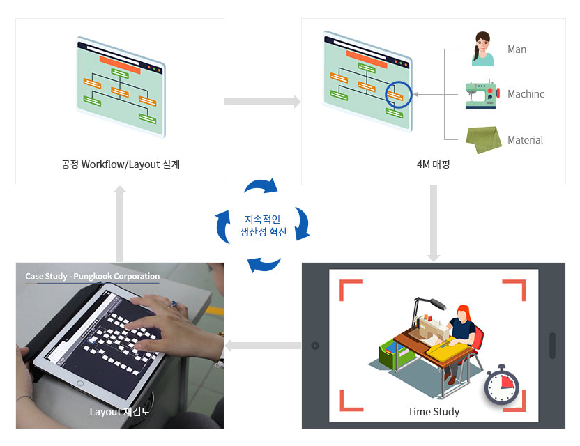 스마트폰, 태블릿 등 최신 터치 디스플레이 환경에 최적화된 공정설계&최적화 솔루션입니다. 공정설계를 시각적으로 빠르게 프로토타이핑할 수 있고, 생산현장에서의 Time Study 기반 개선활동을 자동화하여 항상 라인을 최신 상태로 유지할 수 있습니다.