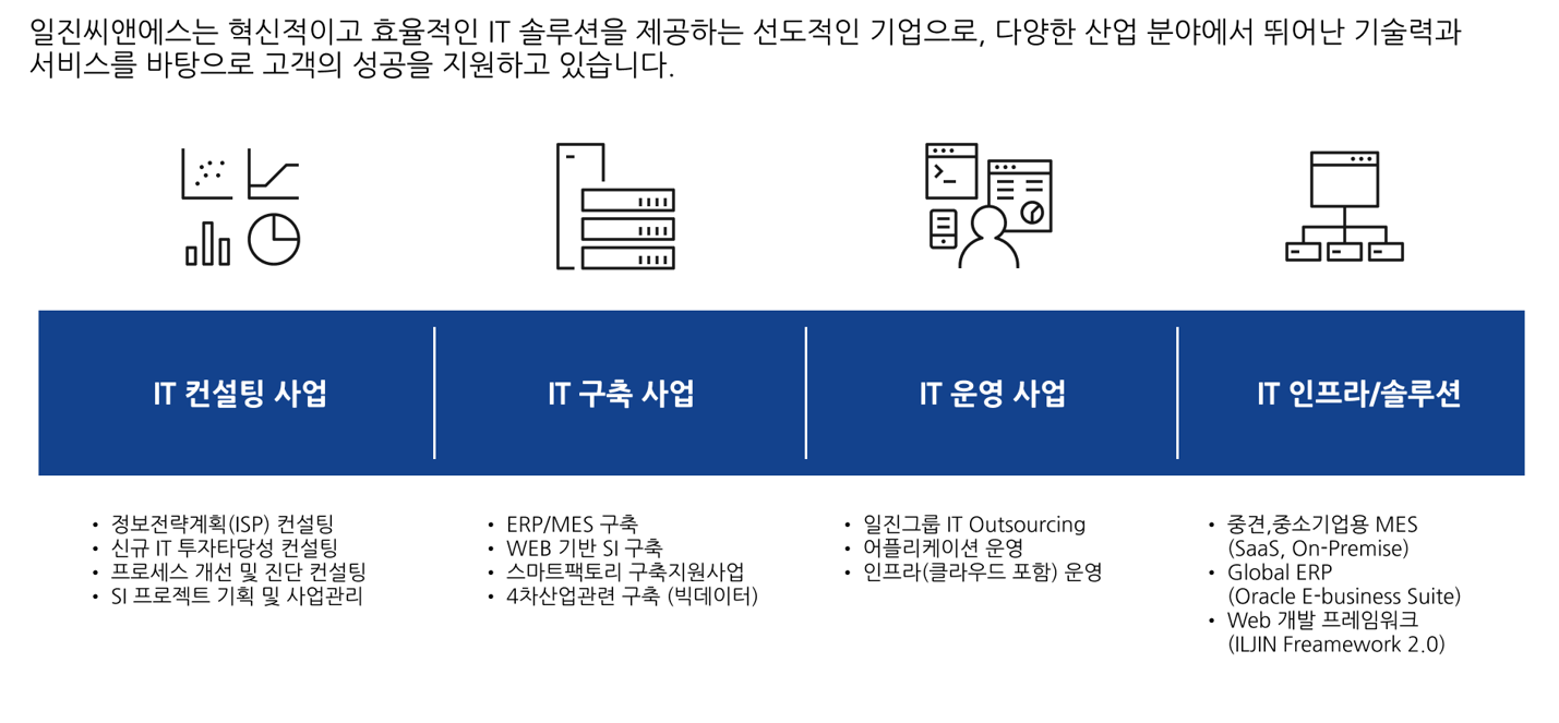 시스템 통합(SI), IT아웃소싱, IT인프라, IT컨설팅, 등 IT Total 솔루션을 제공하고 있으며 고객 성장과 혁신에 헌신하는 동반자 기업입니다.