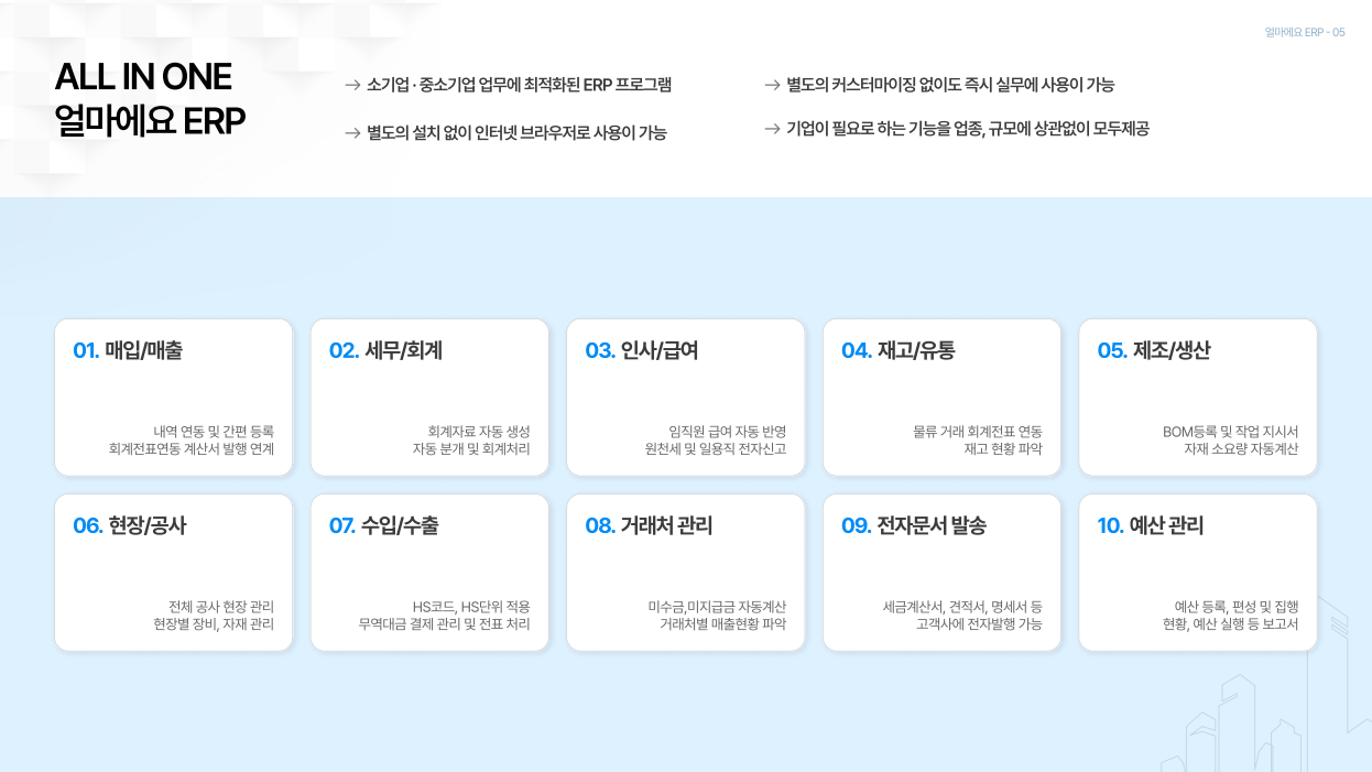 경리에겐 쉽고 사장님에겐 알찬 얼마에요 ERP입니다. 얼마에요 ERP는 재고관리, 현장관리, 급여관리, 경리회계 등 모든 산업에 필요한 핵심 기능을 제공합니다.