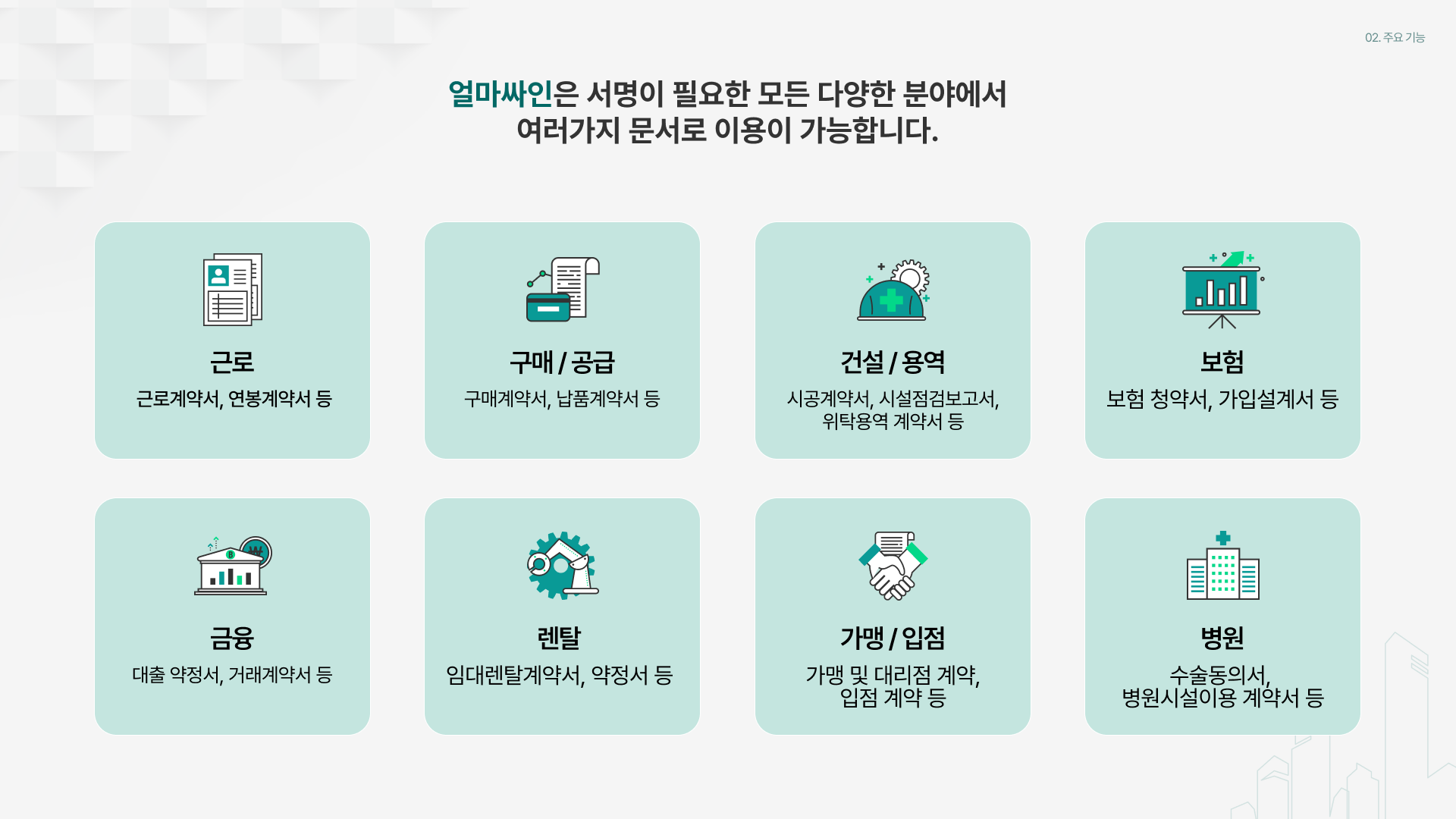 블록체인 기반의 간편하고 안전한 전자계약 서비스, 얼마싸인입니다. 계약 진행 현황을 실시간 확인할 수 있고, 계약서 관리 및 보관도 얼마싸인 한 곳에서 안전하고 간편하게 관리할 수 있습니다.