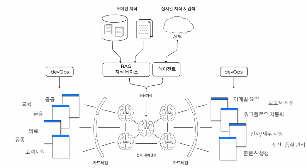 • 1.공공: AI민원상담, AI업무매뉴얼, 문서 요약, 보고서 자동생성 / 2.교육: AI학습가이드, AI입시컨설팅, 다국어 번역 지원 / 3.기타: AI 콘텐츠 생성, 분석 자동화