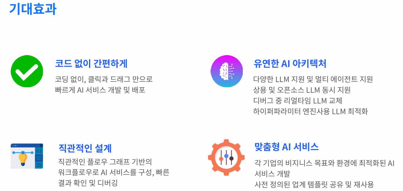 • 기업용 생성형 AI 제작 플랫폼 : 1. AI 워크플로우 설계 / 2. 원클릭 테스트, 배포 / 3. 조직별 프로젝트 현항을 한눈에 통합운영·관리